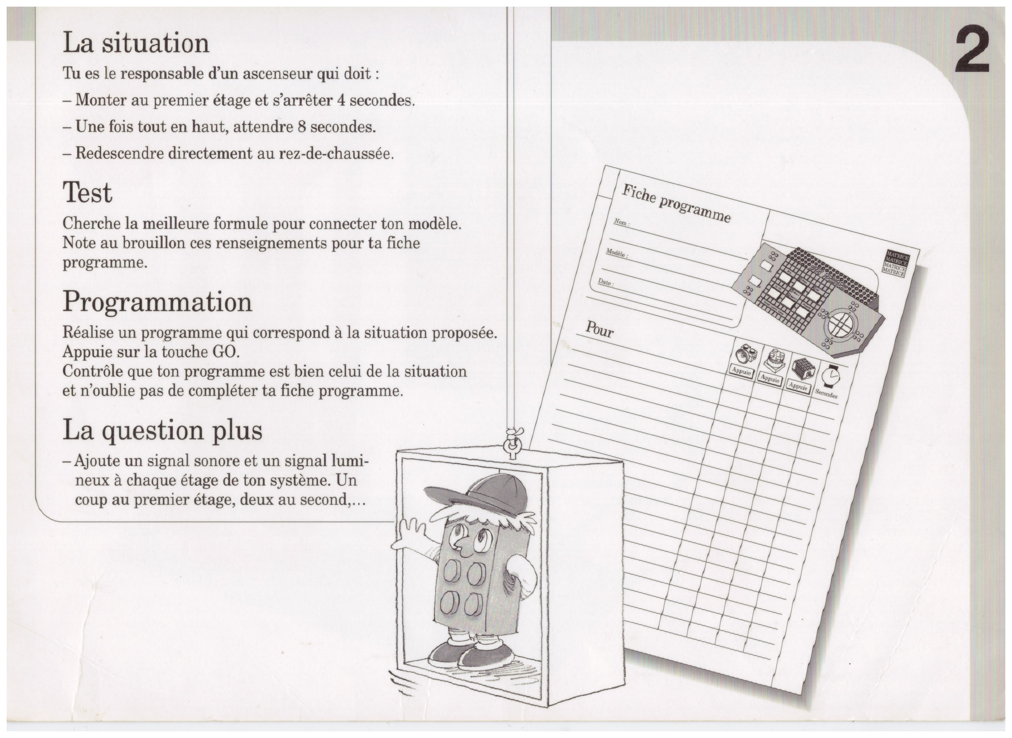 The 9702 set allows the construction of 23 activities essentially oriented towards the use of the Technic Control Center (2840, 9753 only with batteries and 9752 with electricity) [see set 9703 with pedagogical instructions for carrying out the activities], divided into 3 large groups. However, the 8 major constructions are as follows: The basic ones: The revolving theatrical scene, the elevator, a vehicle that draws and the dinaussaurus. The development ones using sheets 4100212, the billboard, are: the cable car, the carroussel and the looper caterpillar (images briefly here).
